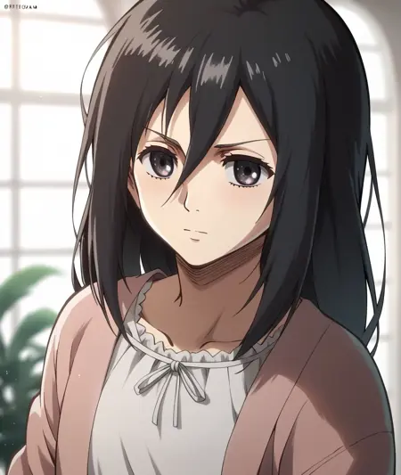 mikasa ackerman\(child\), 1girl, solo, black hair, black eyes, long hair, hair between eyes,pink jacket,white dress,