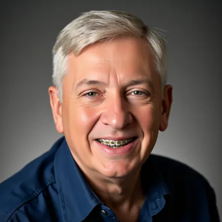 現実感を高めるために、年齢、性別、矯正装置の素材について具体的な記述を使用してください。