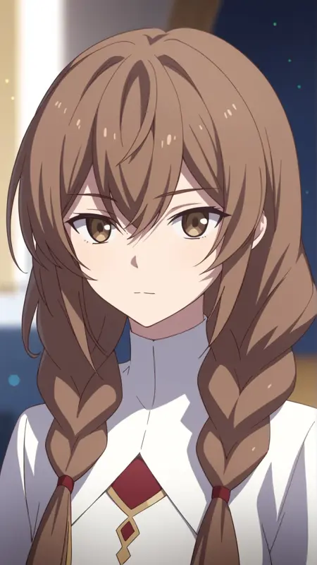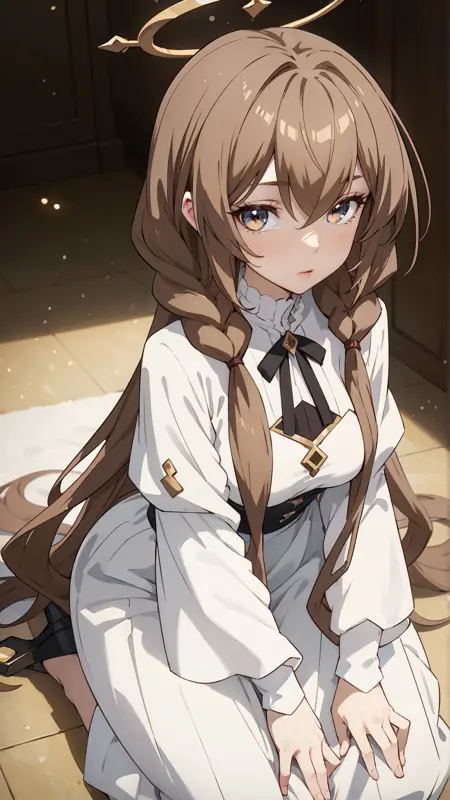 推荐提示词:"rin_vispose, 一位动漫女孩, 1girl, 单人, 长发, 棕发, 长袖, 连衣裙, 蝴蝶结, 双马尾, 棕色眼睛, 发辫, 蓬松袖子, 室内, 围裙, 双辫子, 女仆, 低头, 双手交握, 窗帘, 朱丽叶袖"
