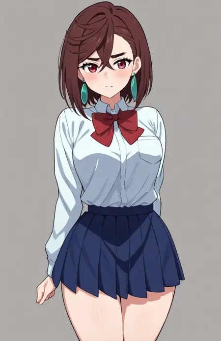 校服:粉色开衫,蓝色迷你裙,红色蝴蝶结领结,有领衬衫,百褶裙