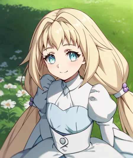 이브, 1소녀, 솔로, 매우 긴 머리, 금발, 파란 눈, 낮은 트윈테일, 흰 드레스, 퍼프 슬리브, 팬티하이즈, 퍼프 슬리브