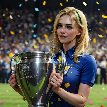 lora:championsleague:0.65, a woman with soccer jersey is holding a handled trophy with black and blue ribbons in her hands on a field of grass with a crowd watching from the stands, confetti