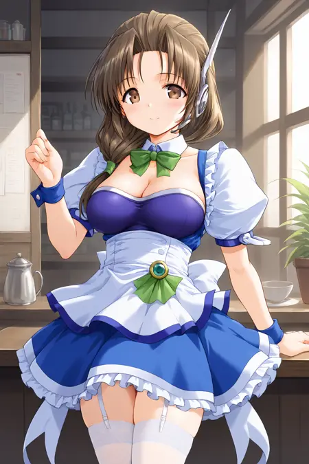 웨이트리스, 프릴, 로봇 귀, 머리 장식, 헤드셋, 콜라르, 분리형 칼라, 넥타이, 녹색 리본, 갑옷, 드레스, 프릴 드레스, 짧은 드레스, 파란 드레스, 짧은 소매, 퍼프 소매, 퍼프 짧은 소매, 흰색 소매, 팔 고리, 손목 밴드, 손목 커프, 브로치, 리본, 뒷쪽 리본, 흰색 뒷쪽 리본, 앞치마, 허리 앞치마, 흰색 앞치마, 치마, 프릴 치마, 주름 치마, 파란 치마, 레이스, 레이스 트림, 허벅지 긴 양말, 흰색 허벅지 긴 양말, 레이스 트림 다리 착용,