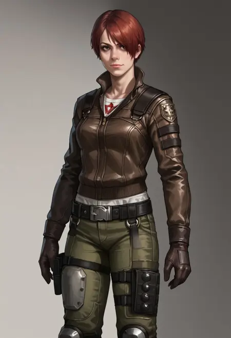 brown leather jacket, green pants, knee pads, belt, holsters, gloves, boots,