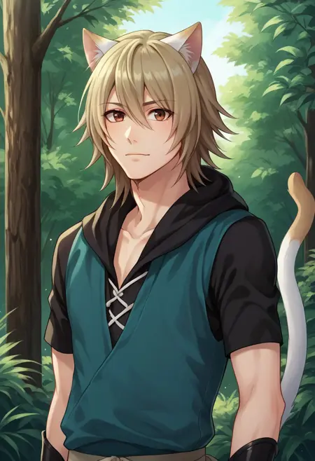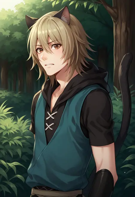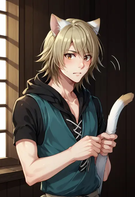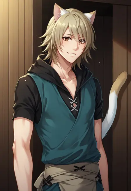 konoe, 1boy, male focus, cat boy, solo, blonde hair, brown eyes, animal ears, cat ears, white ears, hoodie, blue hoodie, hood, black hood, raglan sleeves, short sleeves, pants, black pants, tail, white tail, cat tail, gloves, fingerless gloves, black gloves, boots, brown footwear,