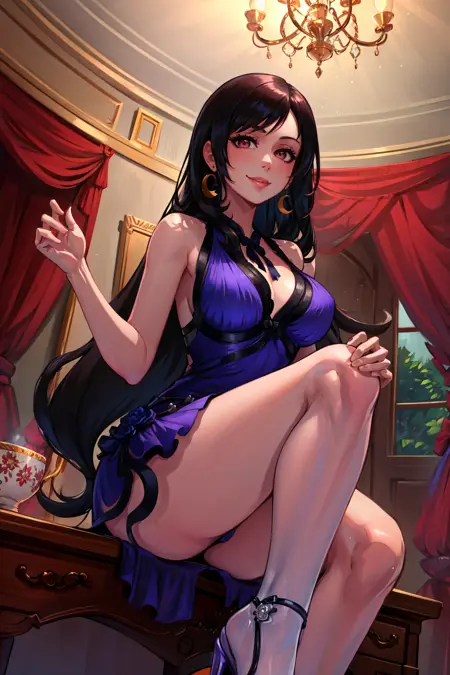 보라색 성인용 드레스를 위해 "mdTifa, red eyes, long hair, crescent earrings, lace choker, cleavage, purple dress, sleeveless, short dress, purple high heels"를 추가하세요.