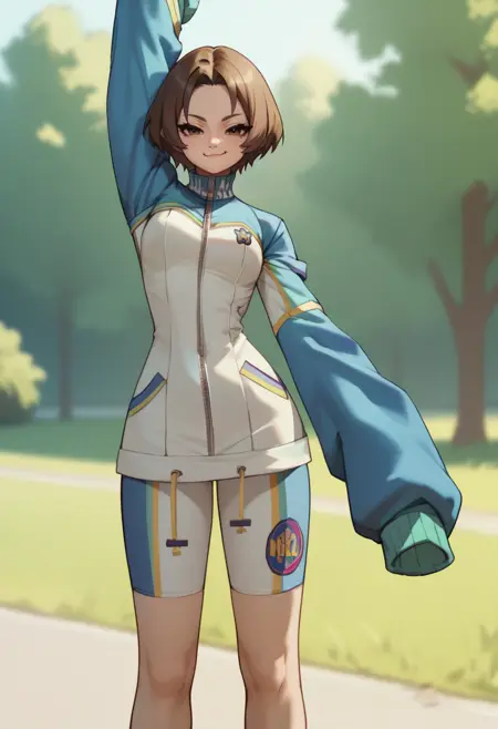 トラックジャケット、手首より長い袖、白い自転車用ショートパンツ、スニーカー、ジッパー、靴下、