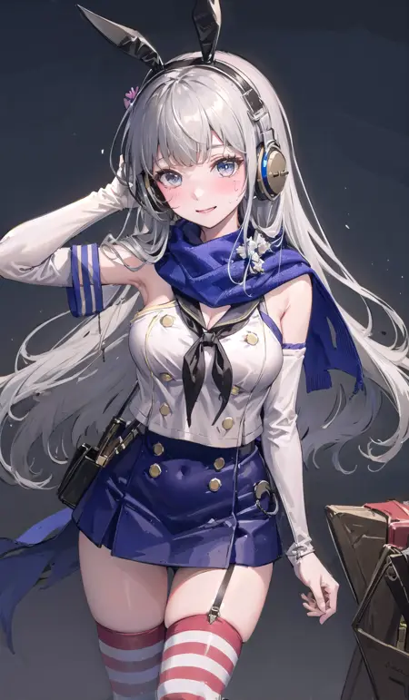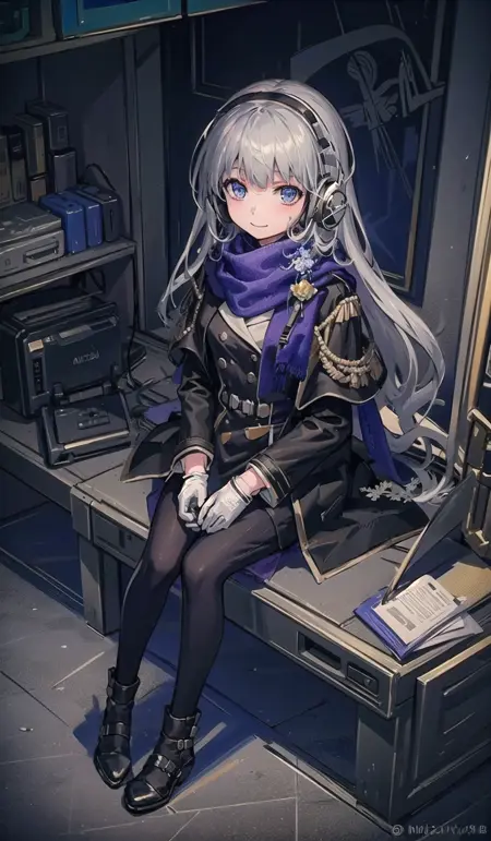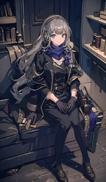 2.OG コスチューム:ヘッドフォン、青いスカーフ、黒い手袋、パンティーホース、黒いコート、