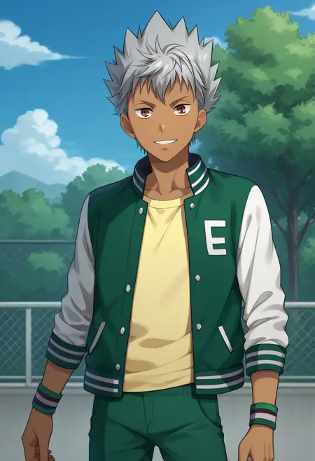 kazuki, 1boy, male focus, solo, grey hair, spiked hair, brown eyes, dark skin, dark-skinned male, jacket, letterman jacket, blue jacket, open jacket, open clothes, shirt, yellow shirt, pants, green pants, boots, ankle boots, brown footwear,