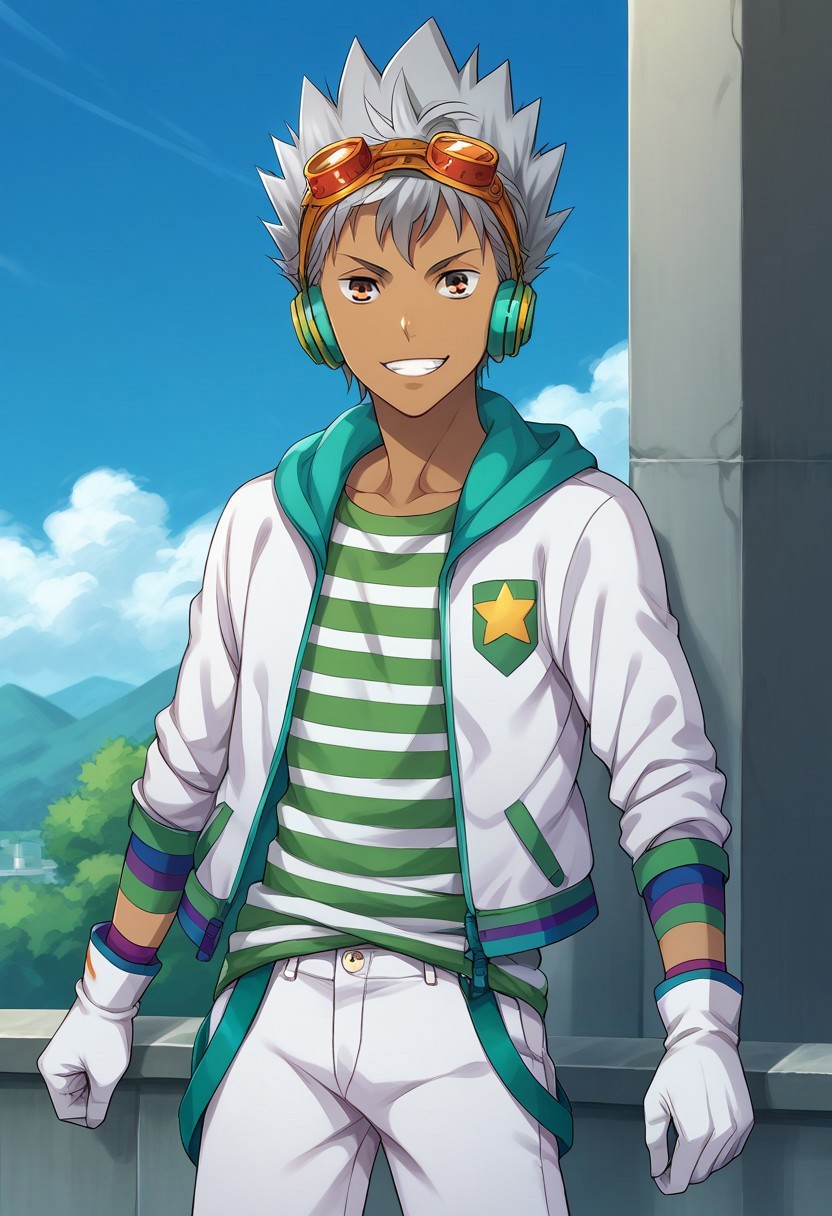kazuki, 1boy, male focus, solo, grey hair, spiked hair, brown eyes, dark skin, dark-skinned male, goggles, goggles on head, headphones, shirt, striped shirt, jacket, white jacket, hooded jacket, hood, open jacket, open clothes, gloves, white gloves, shorts, white shorts, boots, green footwear, cross-laced footwear