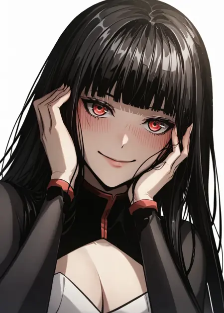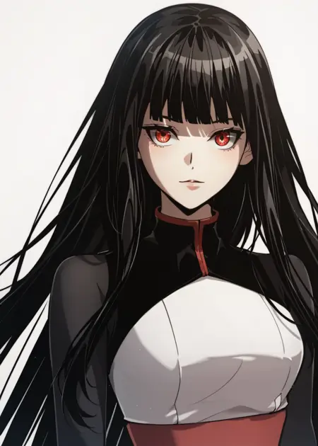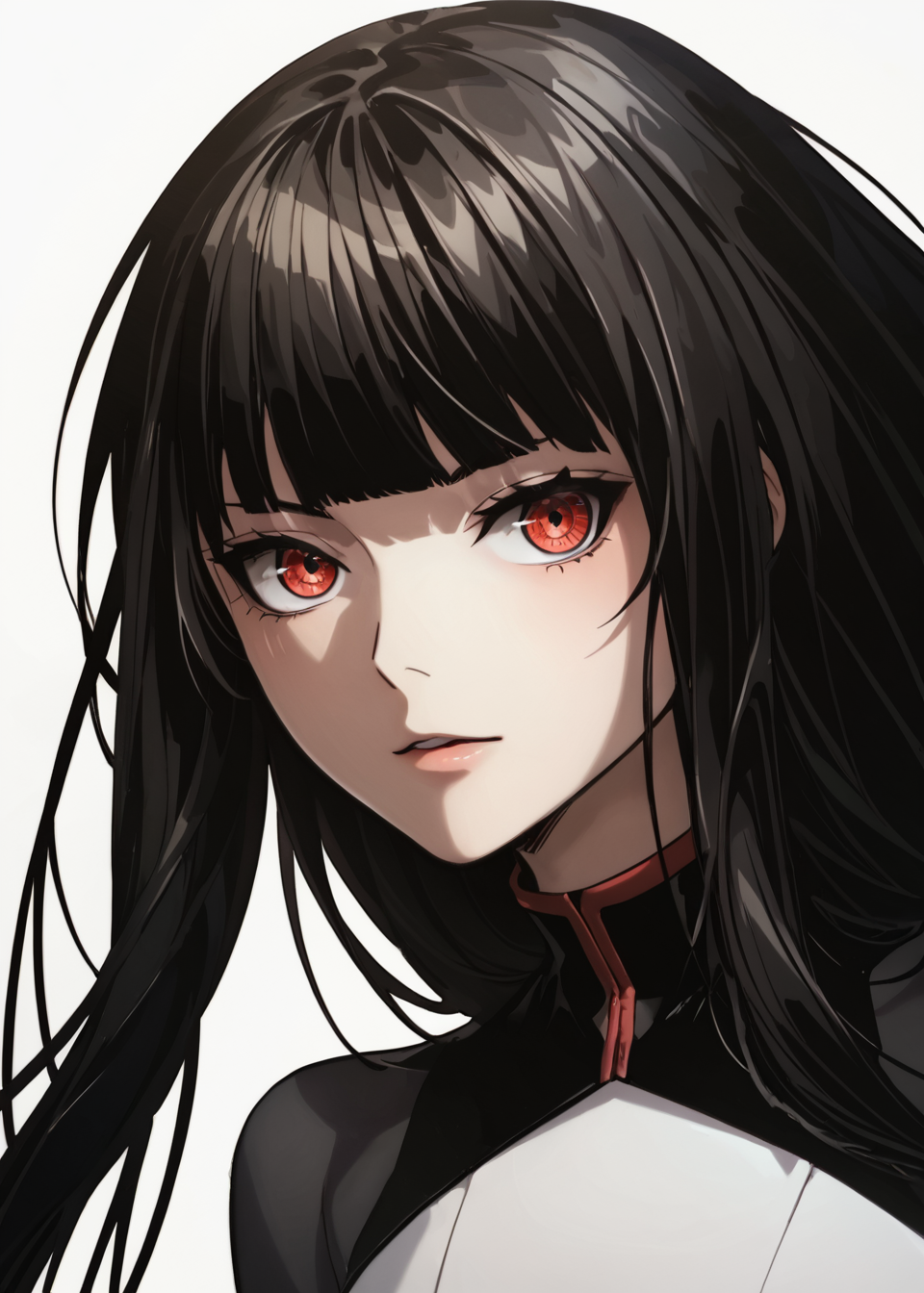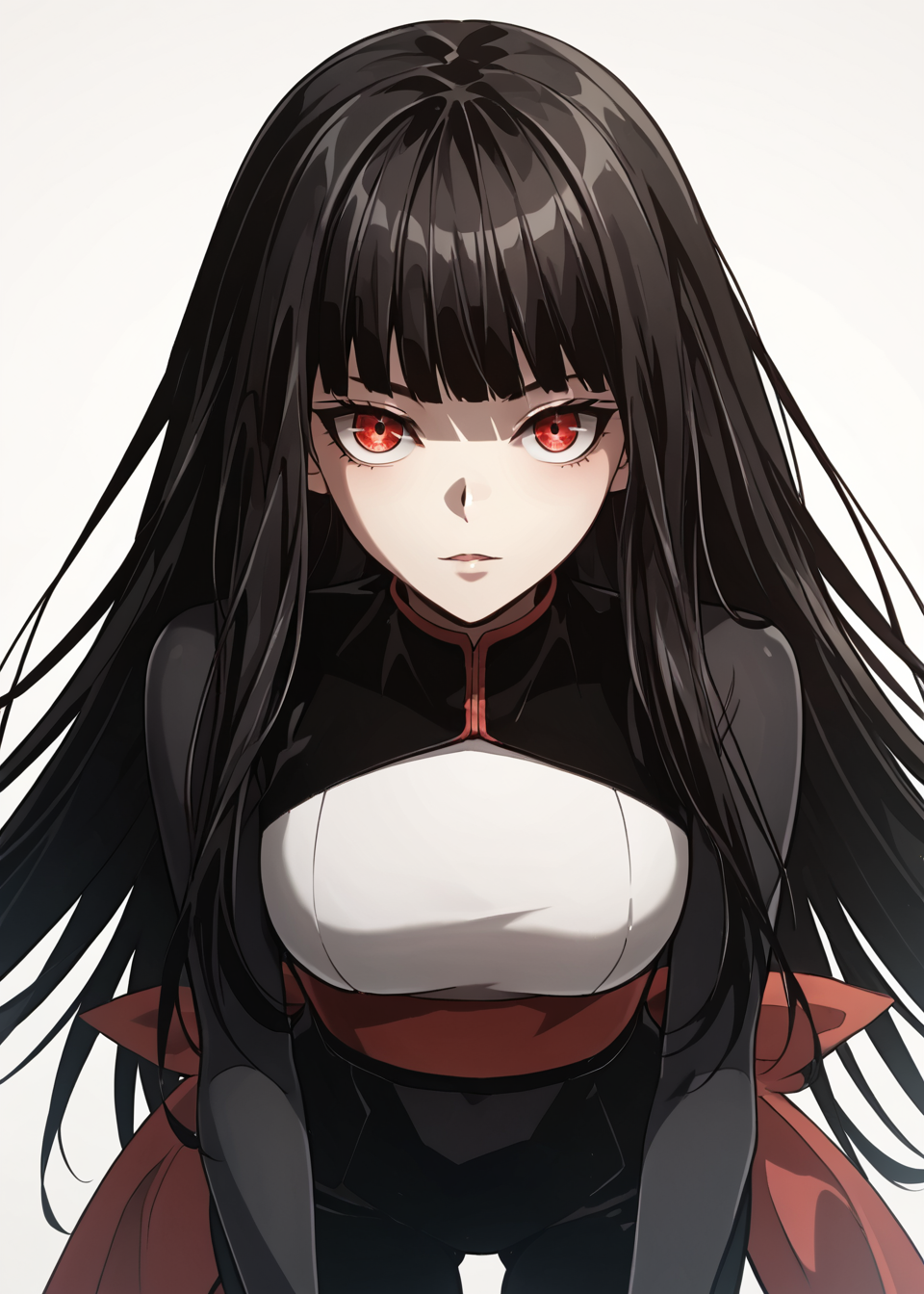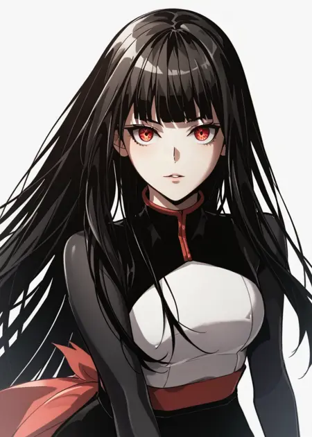 damchunwoo, long hair, perfect eyes, pale skin, red eyes, hime cut, blunt bangs, black hair