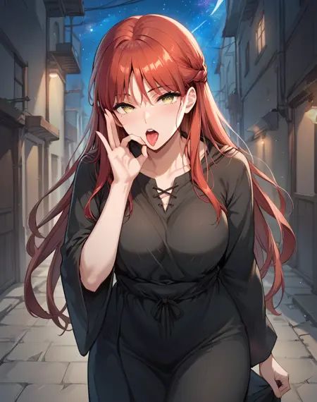 Leah_Testerossa, red hair, long hair, french braid, yellow eyes,