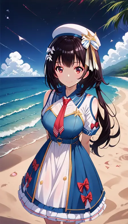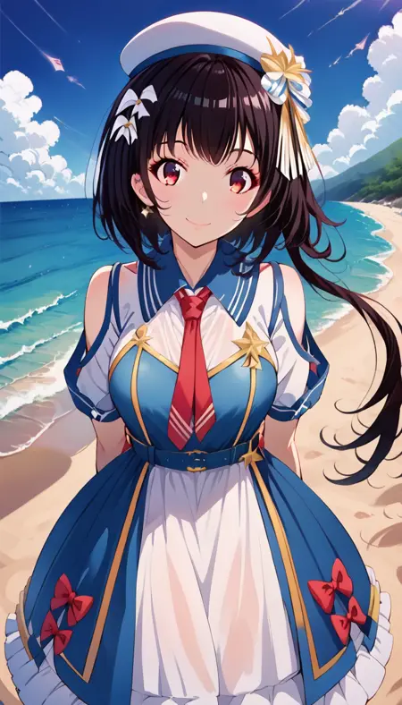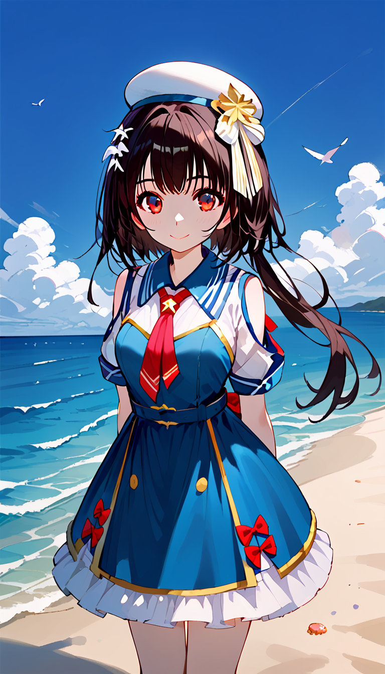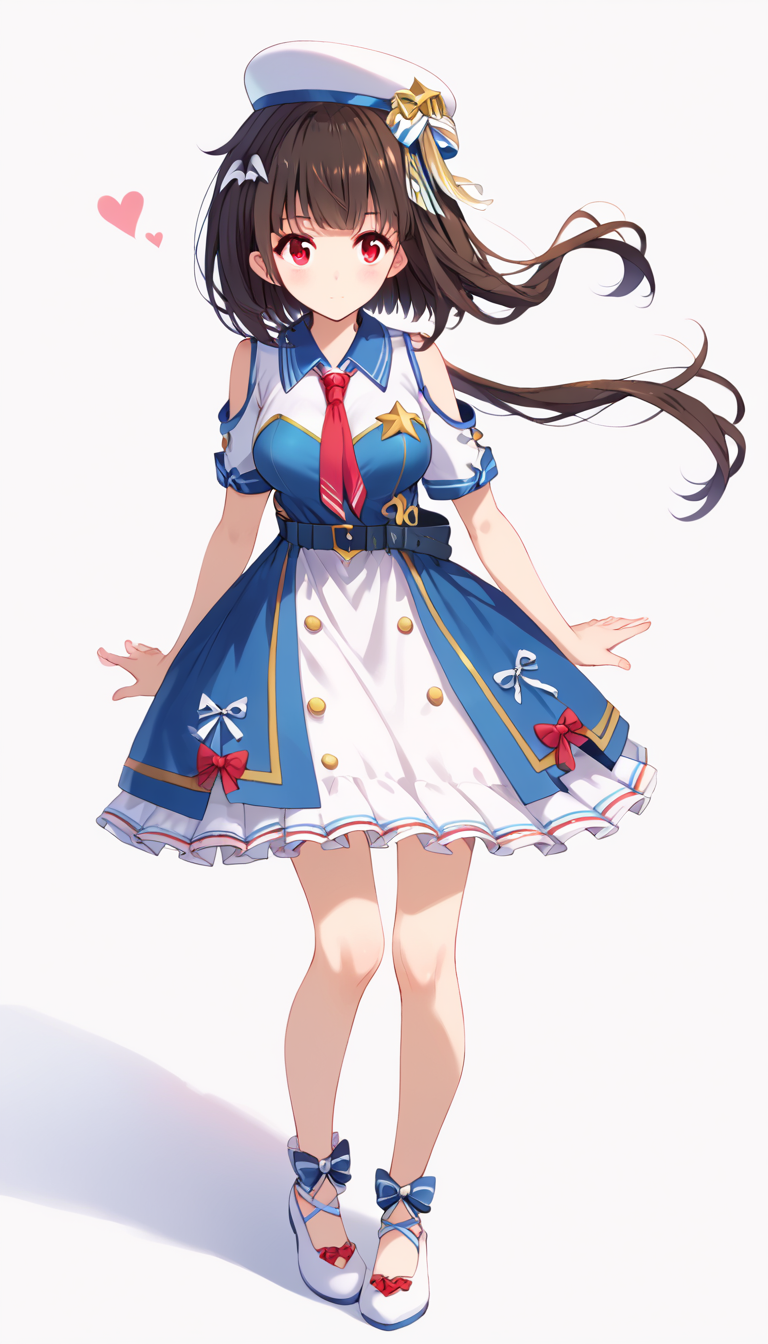 1girl,hat,dress,beret,short sleeves,bow,long hair,red eyes,black hair,necktie,brown hair,bangs,blue dress,white headwear,hair ornament,red necktie,red bow,shoulder cutout,short hair,blet,white footwear,