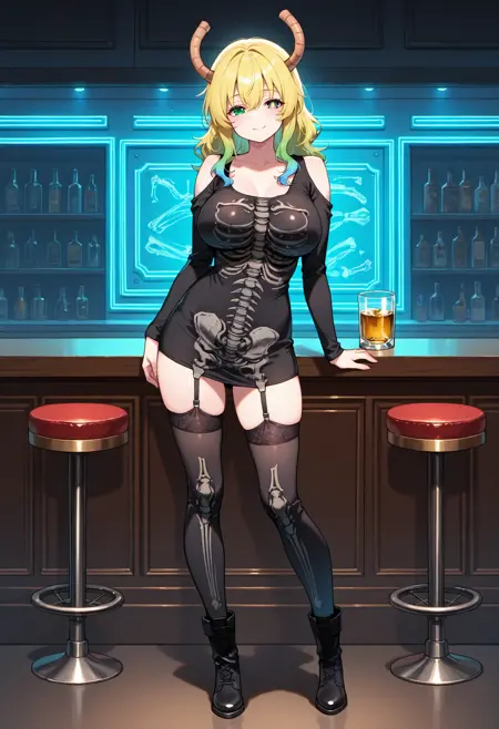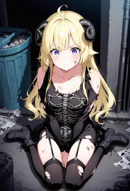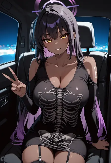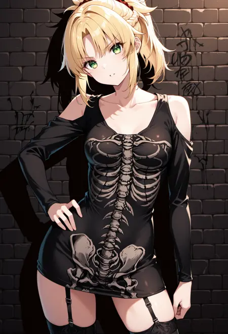 最佳提示词为:骷髅裙、黑色裙子、长袖、肩部镂空、紧身、黑色大腿长筒袜、锁骨、吊袜带、靴子。如果从背面生成图像,可添加 兜帽下垂 以提高准确性。由于该模型是基于电影镜头训练的,我通常会在负面提示中加入 写实,但似乎它的影响没有我预期的那么大。