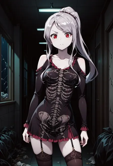 我最近看了《Terrifier》这部电影后制作了这个模型。电影中一位女主角的万圣节装扮我很喜欢:一件紧身短裙,带有骷髅图案,肩部有镂空设计,长袖,搭配同色系的大腿长筒袜。裙子后面还有一个兜帽,但她在影片中从未将它戴起,从正面看也不太明显。骷髅装本身并不新鲜,但我真的很想拥有一个能准确呈现这件特定裙子的模型,而目前的效果还算不错 ^^;