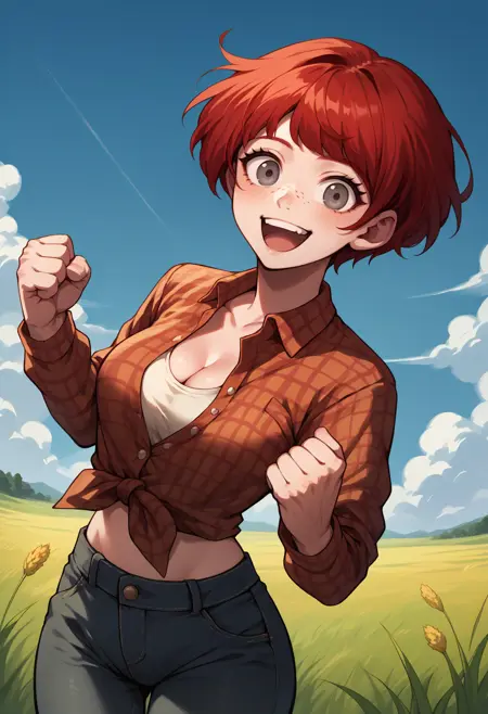 デフォルトの外見: defMahi、赤髪、短髪、灰色の目、そばかす、チェック柄のネクタイ、白シャツ、襟付きシャツ、短袖、緑色のエプロンドレス、プリーツスカート、黒い靴下