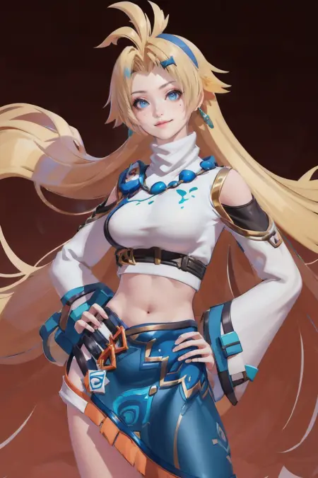 プロンプト: Dextra_LHP, 1girl, solo, long hair, blonde hair, hair ornament, hairband, earrings, looking at viewer, blue eyes, mole, mole under eye, smile, closed mouth, shoulder cutout, breasts, large breasts, clothing cutout, midriff, navel, skirt, legs, boots, socks, ankle boots, high heels, blue footwear, jewelry