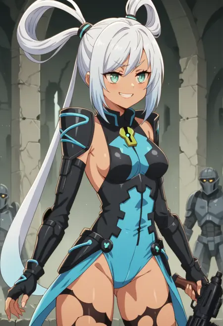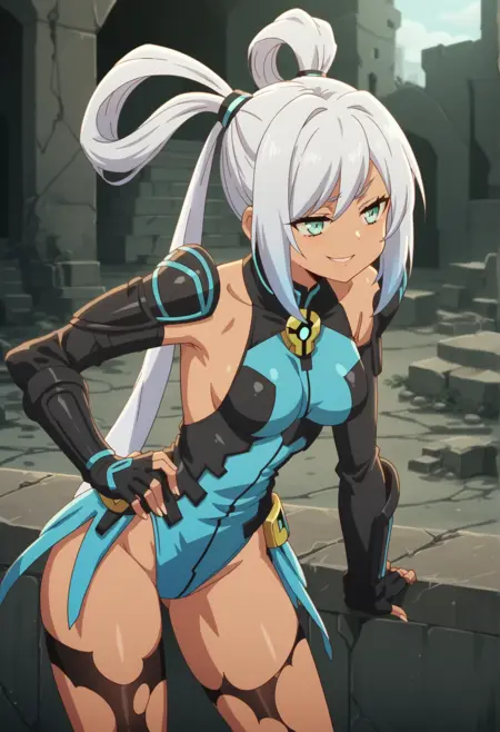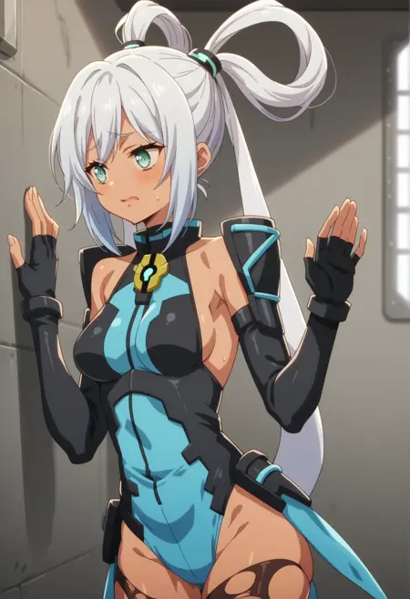 显著标签:深色皮肤、白发、水蓝色眼睛、发圈、发带、符号形瞳孔、分离袖子、露指手套、蓝色紧身衣、撕裂的过膝袜、中等胸部、装甲连体衣。
