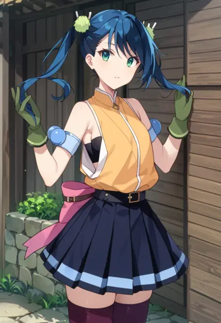 팔찌, 노란색 셔츠, 장갑, 녹색 장갑, 치마, 허벅지까지 오는 양말, 소매 없음,