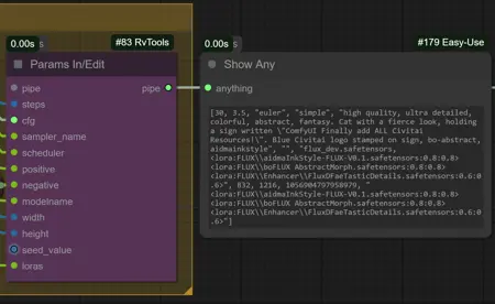 このワークフローでは、Loraを含む画像に使用されるすべての情報を収集するRvToolノードを利用しています。また、Loraを有効にするためのトリガー単語を自動的に追加する、信頼できるLora Auto Trigger Wordsノードも追加しています。