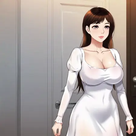 白色连衣裙触发词:YeonSu, 1girl, 大胸, 棕发, 长发, 白色连衣裙, 深沟, 锁骨, 长袖, 蓬松袖子, 棕色眼睛, 刘海, 嘴唇, 牛仔镜头