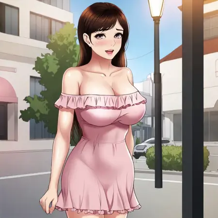 粉色连衣裙触发词:YeonSu, 1girl, 大胸, 棕发, 粉色连衣裙, 长发, 裸露肩膀, 深沟, 棕色眼睛, 荷叶边, 露肩, 锁骨, 露肩连衣裙, 牛仔镜头
