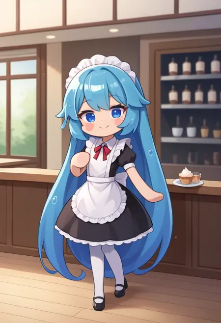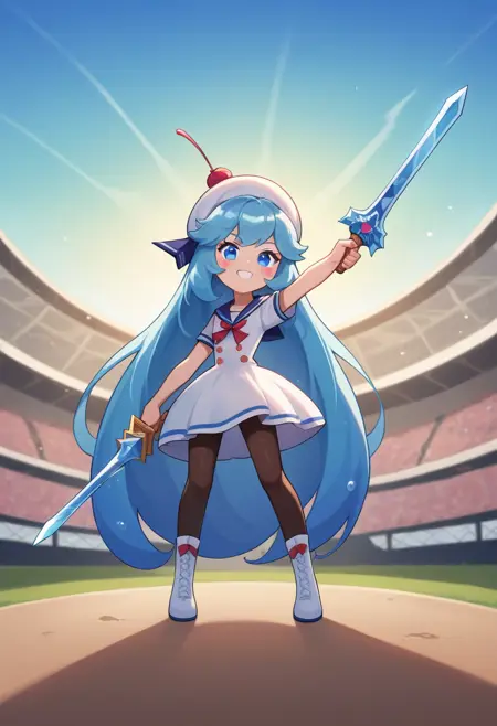 prompts: cresocookie, no humans, 1girl, solo, blue eyes, blue hair, smile, sword, long hair, hat, white dress, blue legwear, cherry, white footwear, chibi,