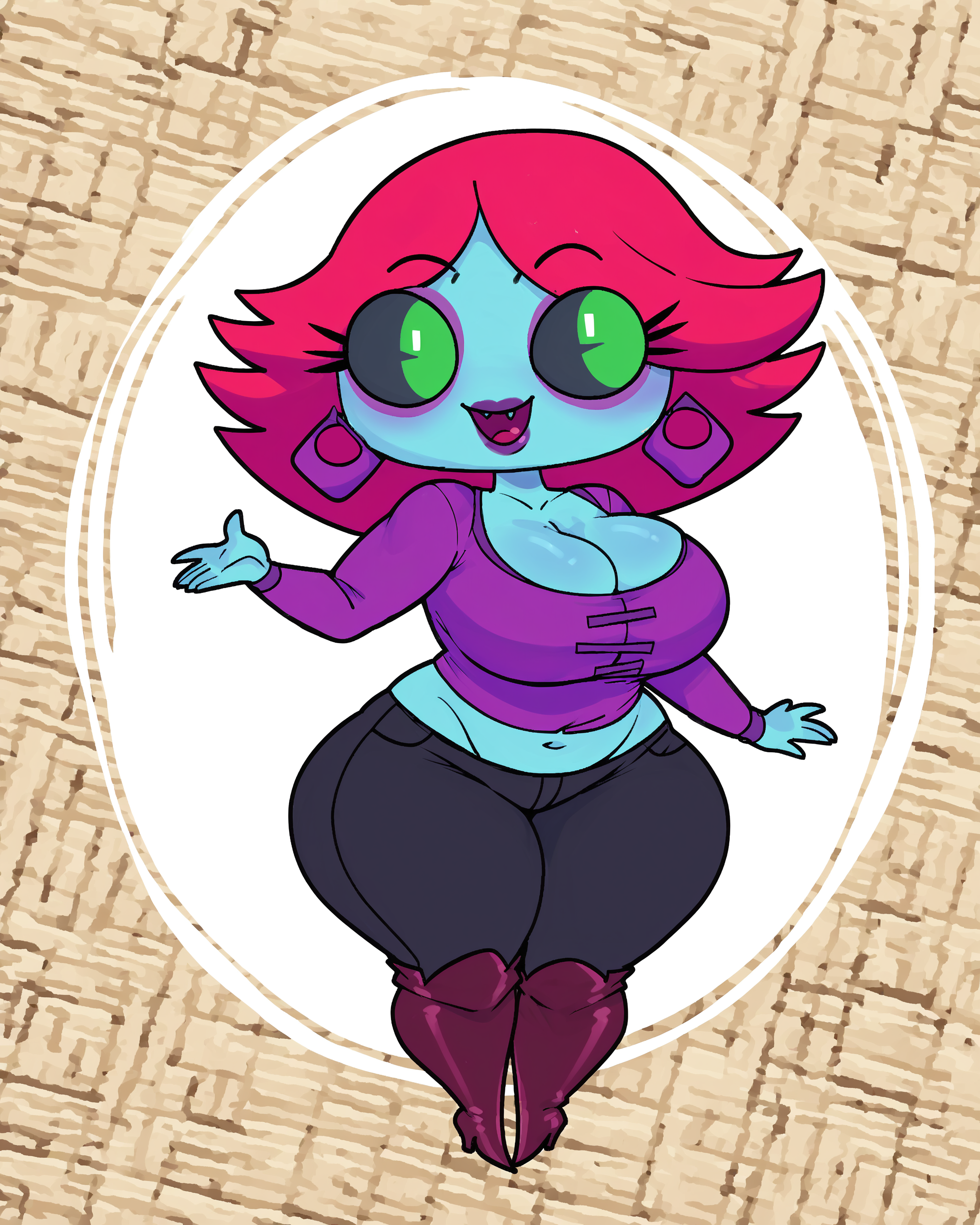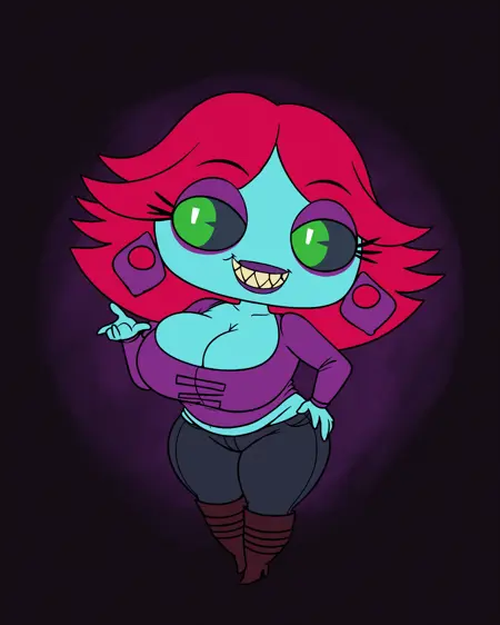 1girl, boots, heels, noseless, black sclera, colored sclera, purple earrings, midriff, cleavage, green eyes, shirt, lips, makeup, eyeshadow, long sleeves, red hair, colored skin, jeans