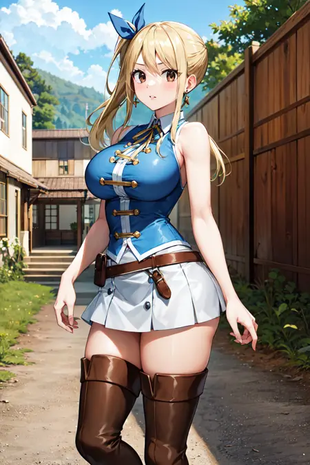 outfit3 (X792)lucy heartfilia, blonde hair, long hair, side ponytail, blue ribbon, large breasts, earrings, thigh boots, blue shirt, sleeveless shirt, white skirt