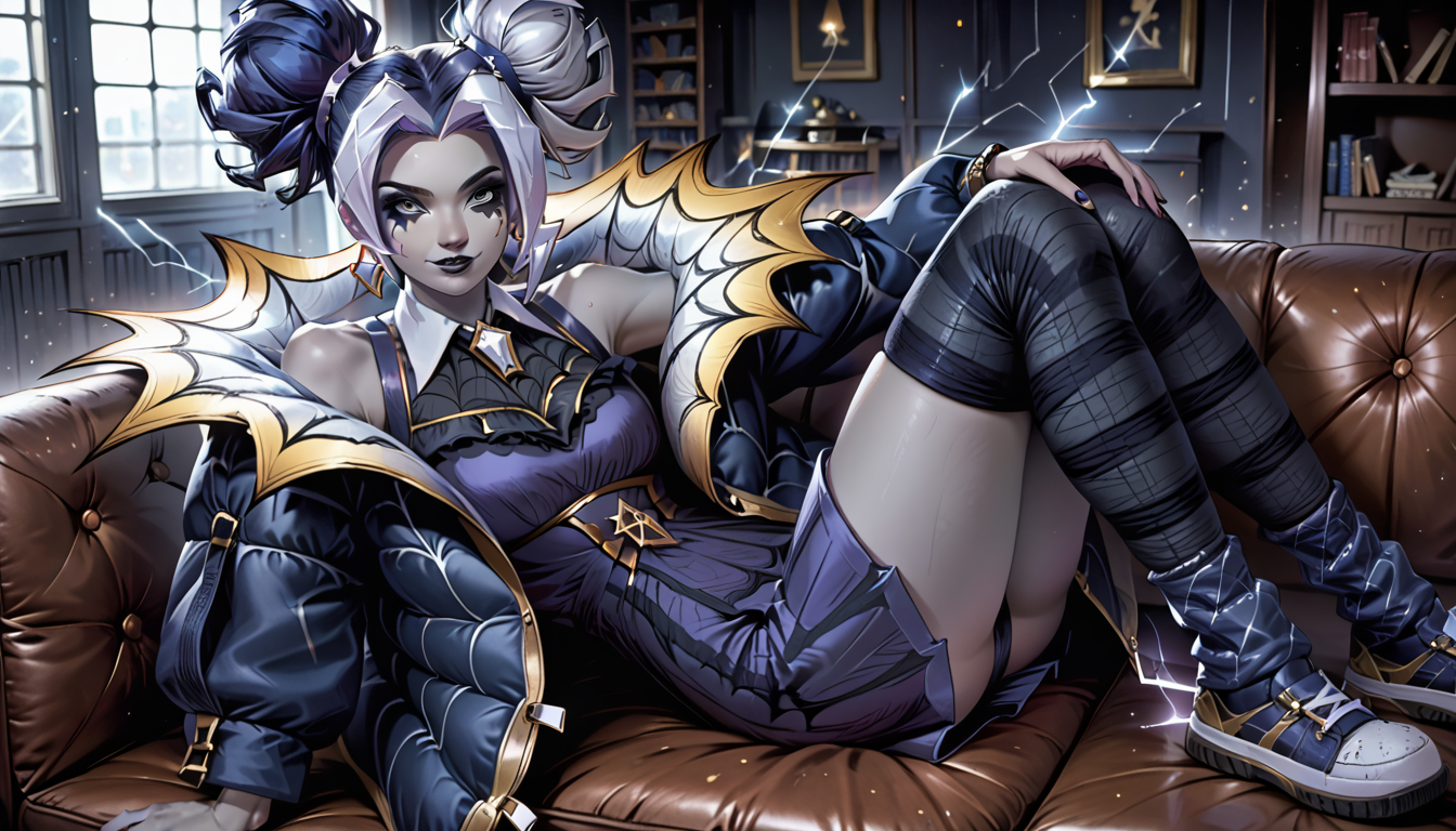lora:Tests/PrestigeFrightNightZeri:1, (prestige fright night zeri, thighhighs, cell shading, grey skin, electricity)