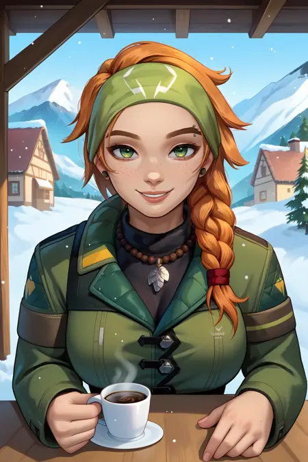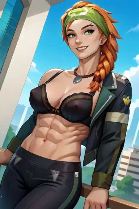 Appearance : vsk, toned, large breasts, freckles, orange hair, green eyes, green headband, long hair, braided ponytail, hair over shoulder, necklace, eyebrow piercing