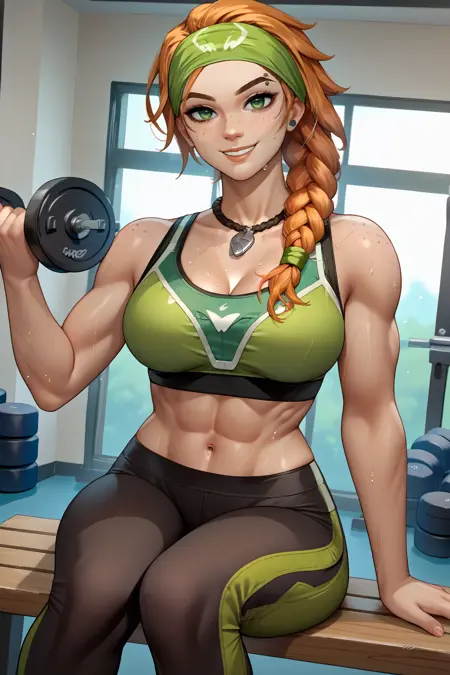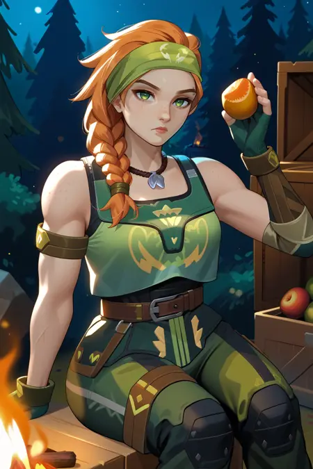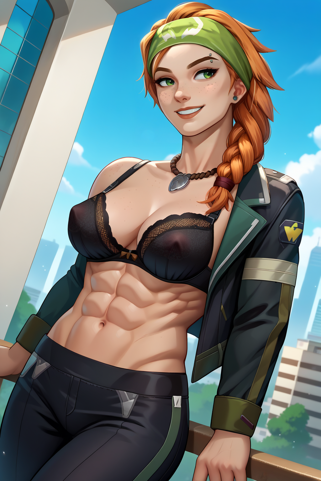 外見:vsk、引き締まった体型、大きな胸、そばかす、オレンジ色の髪、緑の目、緑のヘアバンド、長い髪、編み込みポニーテール、肩にかかる髪、ネックレス、眉ピアス