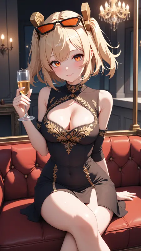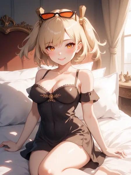 标签:tj_burnice,橙色眼睛,金发,短发,两侧高束,发饰,眼镜戴在头上,