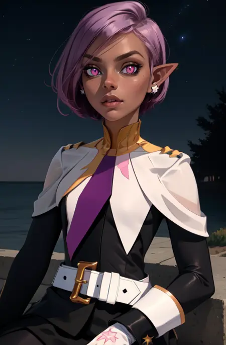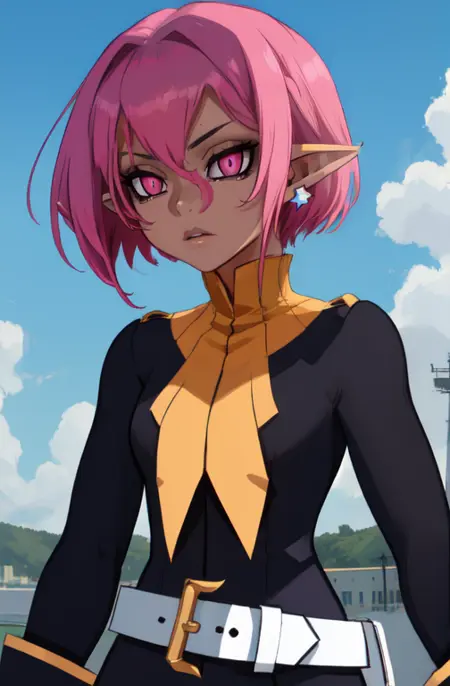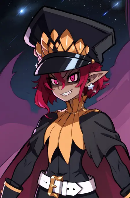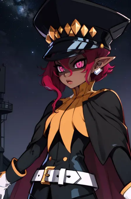 白色手套,短耳环或耳夹,黑色长袖制服,或黑色上衣配长袖,黑色短裤,黑色靴子,白色腰带,shako帽,斗篷,