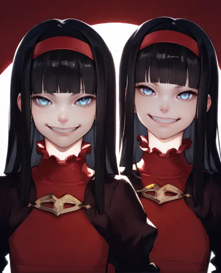 red hairband, red dress, dark puffy sleeves, pantyhose, red shoes,