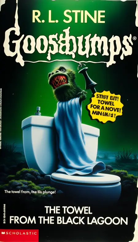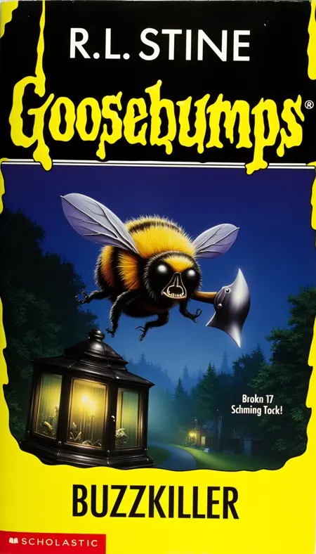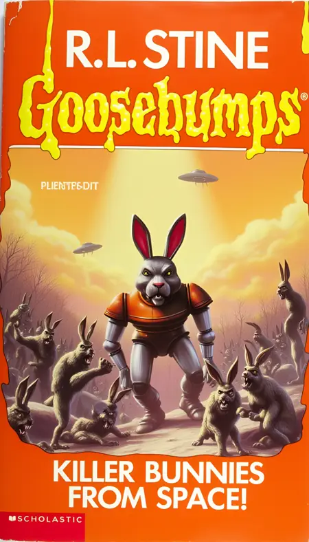 小说《INSERT YOUR BOOK NAME HERE!》的封面,作者R.L. Stine,属于《鸡皮疙瘩》系列。最上方以小号白色字体写着“R.L. Stine”。标题下方以大号、粗体、INSERT COLOR HERE颜色的风格化卡通字体写着“Goosebumps”。背景为从INSERT COLOR HERE到顶部INSERT COLOR HERE的渐变色。中间图像为INSERT YOUR IMAGE PROMPT HERE。底部以小号白色字体写着“INSERT YOUR BOOK NAME HERE!”。
