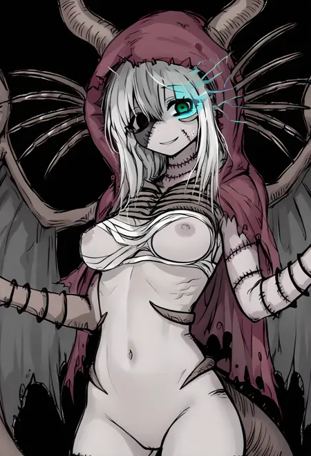 Jabberwockbs2, 1girl, breasts, horns, white hair, long hair, black eyes, medium breasts, glowing, wings, stitches, colored skin, heterochromia, nipples, navel, hood, undead, bandages,
