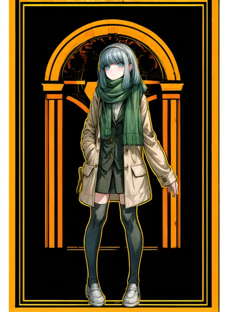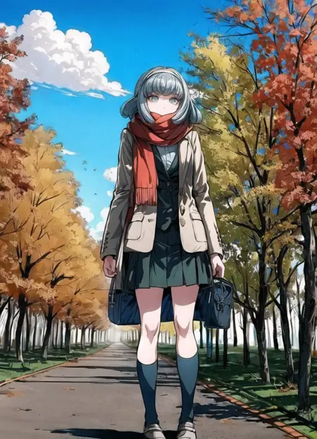 立っている標準装備: 1girl, Miaya Gekkogahara, standing, full body, blue-gray hair, light gray headband, blue eyes, long eyelashes, pale brown jacket, black vest, white dress shirt, black skirt, black socks, white slippers, dark red scarf