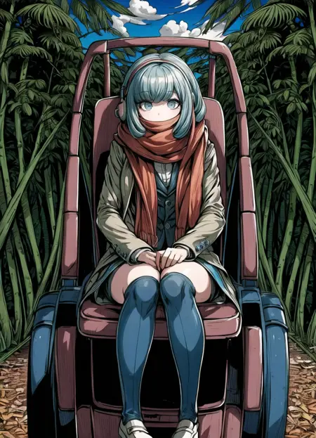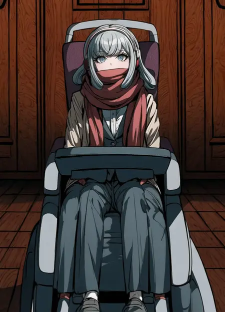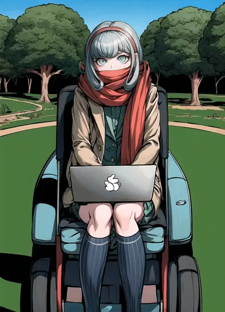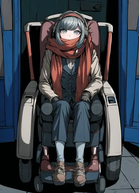 車いすの標準装備: Miaya Gekkogahara, 1girl, white dress shirt, long red scarf, blue eyes, pale brown jacket, blue-gray hair, headphones, wheelchair, black vest, silver laptop, Danganronpa