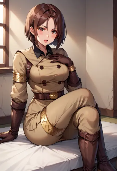 "KOFWHP,棕色头发,短发,棕色眼睛,军装,棕色长裤,大腿袜,手套,腰带,臂章"