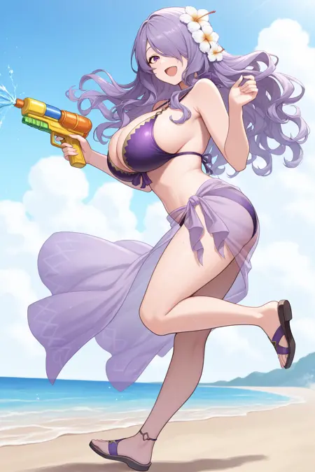 서머 카밀라를 원할 경우: "sumCm, 라일락 헤어, 물결 모양 헤어, 긴 헤어, 한쪽 눈에 걸친 헤어, 헤어 꽃, 흰 꽃, 보라색 비키니, 투명 사롱" 추가.