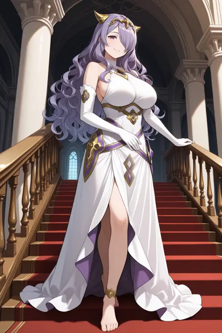 레전더리 카밀라를 원할 경우: "lgCm, 라일락 헤어, 물결 모양 헤어, 긴 헤어, 한쪽 눈에 걸친 헤어, 원형 관, 왕관, 어깨 노출, 가슴 돌출, 갑옷 드레스, 분리된 소매, 보라색 스커트, 보라색 장갑" 추가.