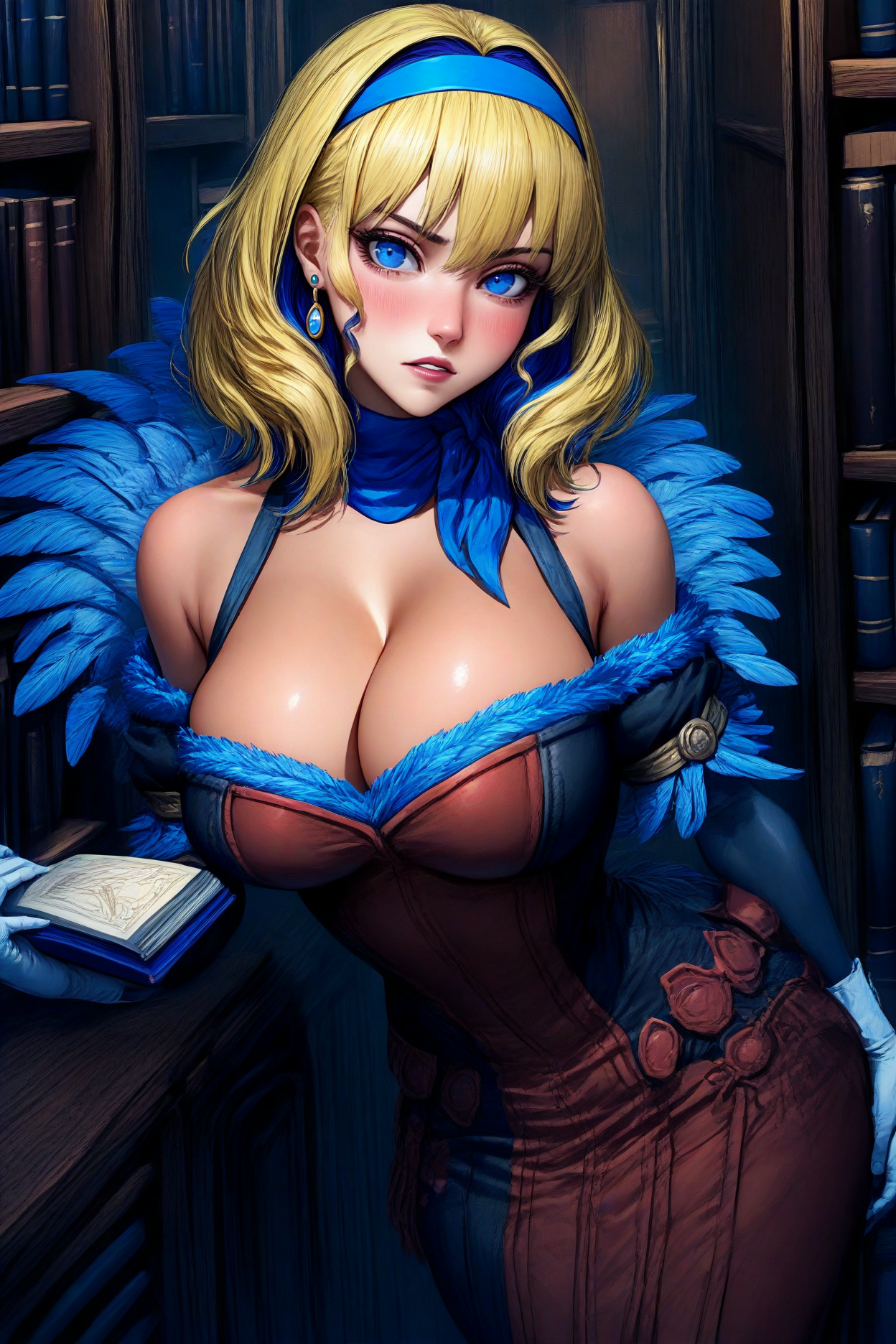 Three Hopes姿には:"hopecvn, ブロンドヘア, 紫髪, 多色髪, 中くらいの長さの髪, ヘアインテイクス, 青い目, ピアス, 青いヘアバンド, 青いスカーフ, 小さなスカーフ, ツートンドレス, 赤いドレス, 黒いドレス, オフショルダードレス, ロングドレス, フェザートリム, 胸元, 白い手袋, 肘まで手袋, 金のブレスレット" を追加してください。