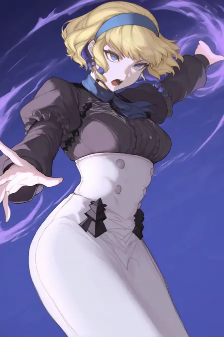 アカデミー姿には:"defcvn, ブロンドヘア, 紫髪, 多色髪, 短髪, 青い目, ピアス, 青いヘアバンド, 青いスカーフ, 小さなスカーフ, 黒いシャツ, 中心のフリル, ジュリエットスリーブ, 白いスカート, ウエストハイスカート, 黒いボタン" を追加してください。