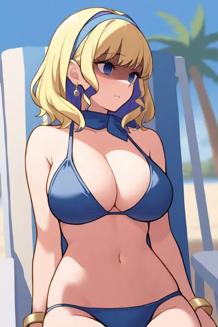 サマー・コンスタンスには:"smcvn, ブロンドヘア, 紫髪, 多色髪, 短髪, 青い目, 青いヘアバンド, ヘアフラワー, ピアス, 青いスカーフ, 小さなスカーフ, 黒いビキニ, フリル付きビキニ, アンダーブーブカットアウト, 白いワンピース水着, 白いブレスレット, ビーズブレスレット, フリル付きアームレット, 白いサロング, サンダル, 青いネイル" を追加してください。