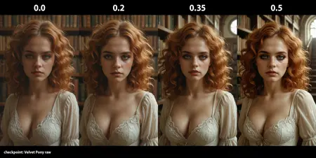 이 모델은 Velvet Pony로 학습했지만, 어떤 XL 또는 Pony 체크포인트에도 작동하는 것으로 보입니다. 학습 데이터는 사실적인 이미지였기 때문에 이 점도 영향을 줄 수 있습니다.