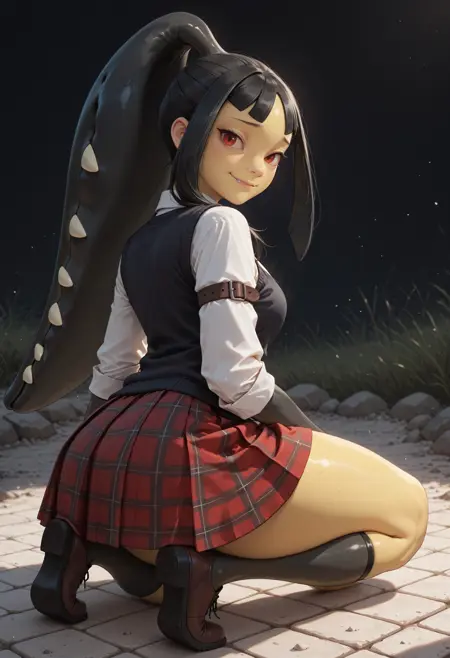 (ポジティブプロンプト) マウィル、人間化、黒髪、赤い目、アイライン、サイドロックス、色付き肌、黄色い肌、ツートーン肌、黒い肌、追加の口、長い髪