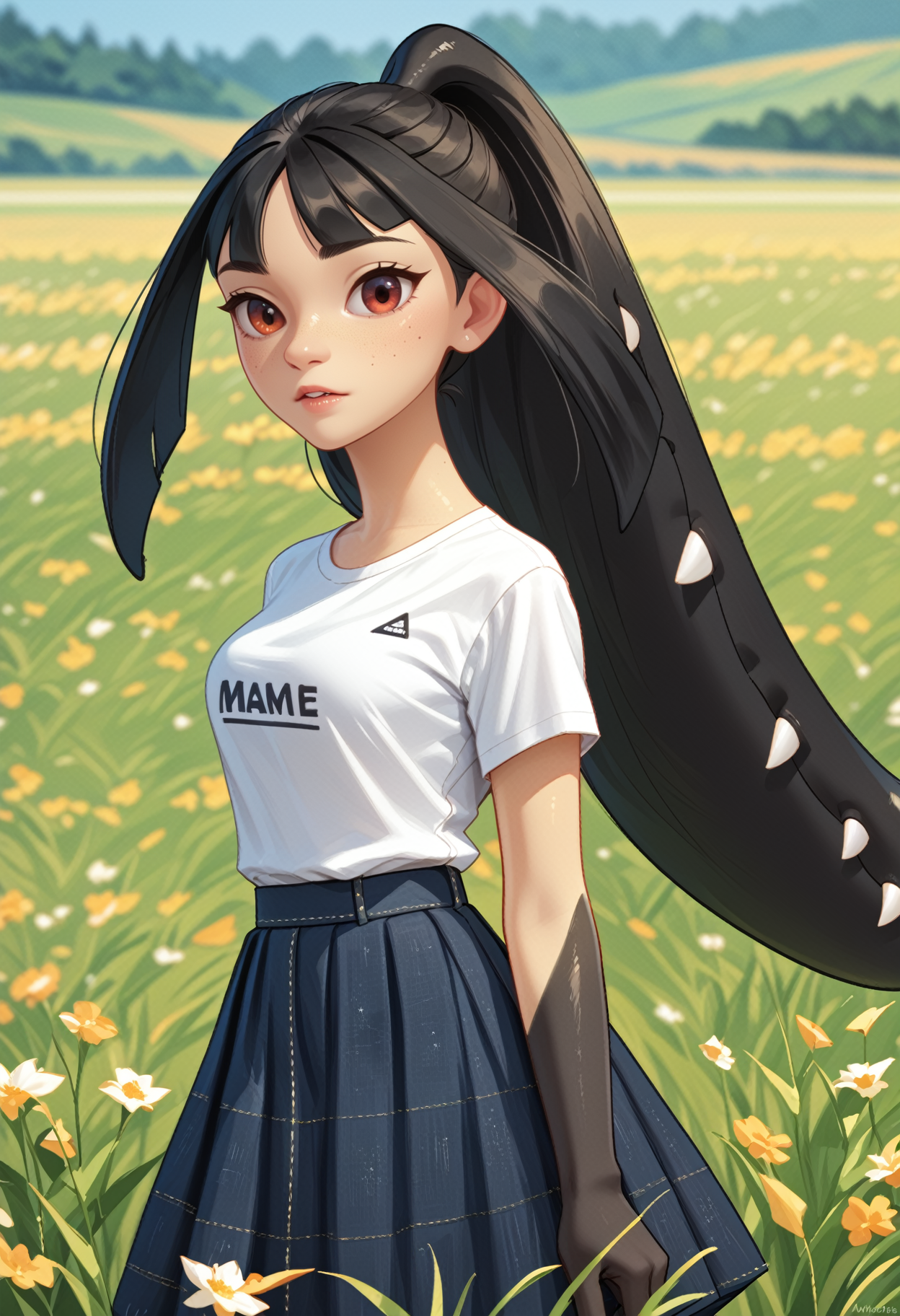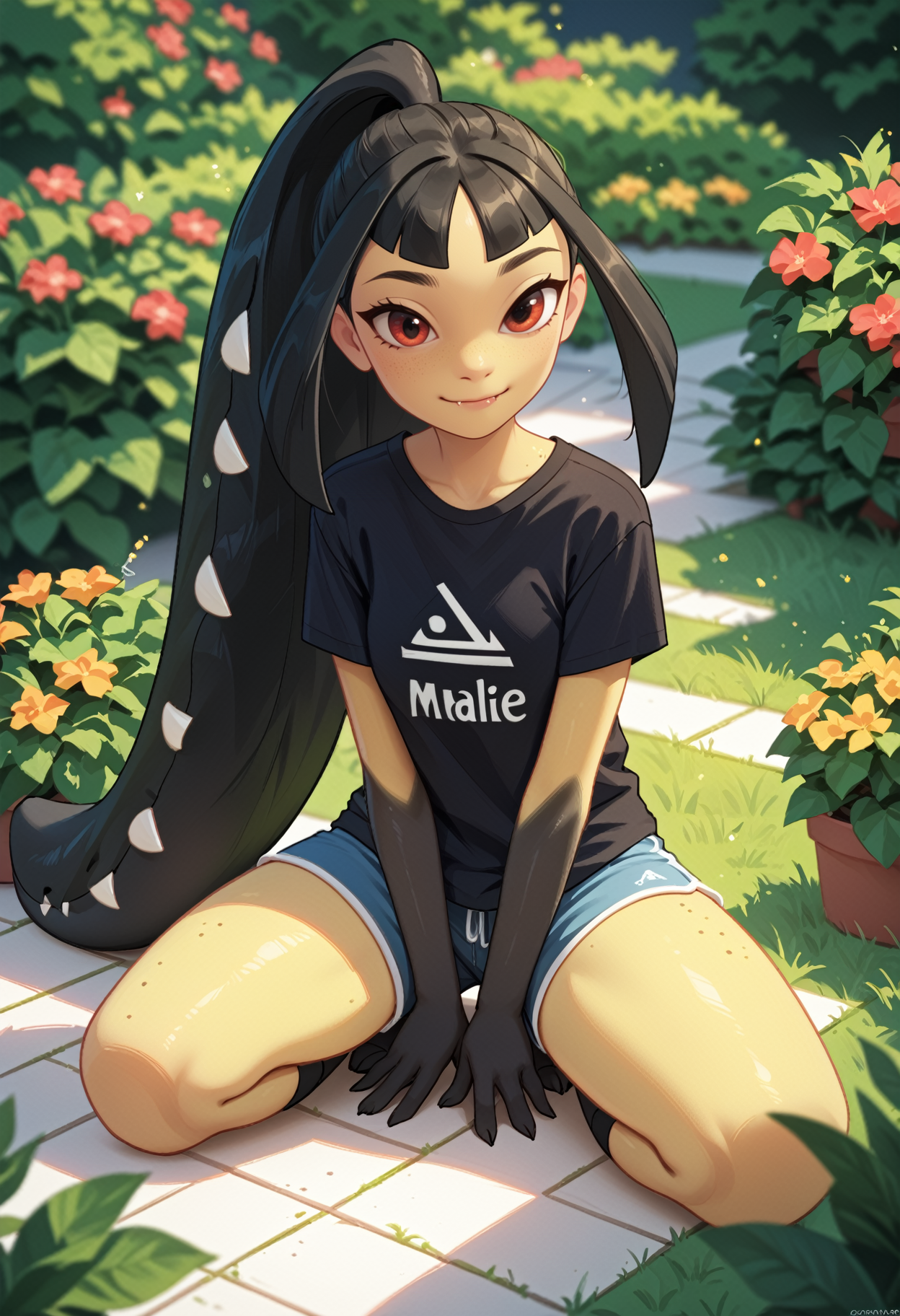 (Positive Prompts) mawile, personification, black hair, red eyes, eyeliner, sidelocks, colored skin, yellow skin, two-tone skin, black skin, extra mouth, long hair,