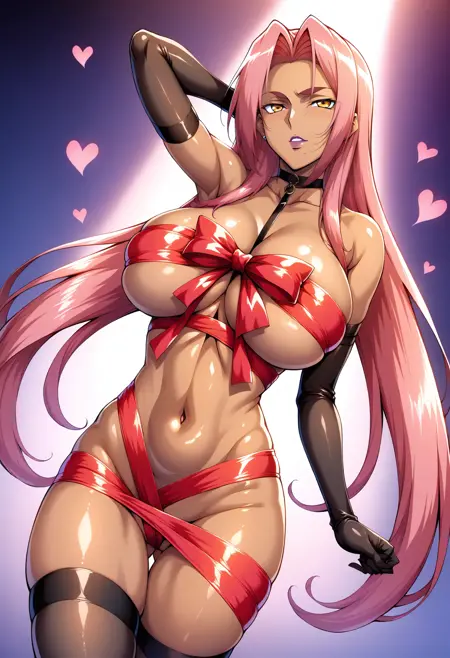 ig-sg,naked ribbon,dark-skinned female,black elbow gloves,ribbon,flower,cowboy shot,navel,standing,choker