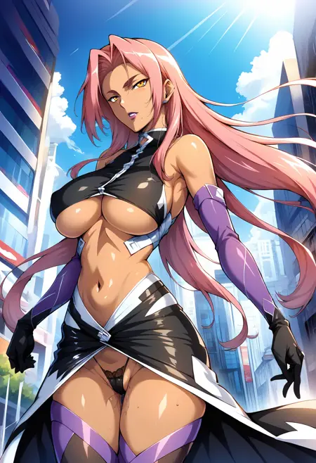 ig-tk,dark-skinned female,large breasts,gloves,full body,navel,fishnets,thighhighs,cleavage,center opening,standing,black gloves,bodysuit,leotard,boots,armor,
